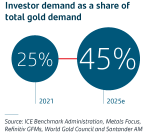 Num contexto em que os riscos geopolíticos persistem, a inflação não desapareceu e os investidores percecionam que os bancos centrais continuarão a dar prioridade ao crescimento em detrimento do controlo de preços, o ouro mantém-se como uma cobertura (hedge) eficaz e um elemento essencial na diversificação das carteiras. Os fundamentos subjacentes também permanecem sólidos: a continuidade das compras por parte dos bancos centrais e o regresso da procura dos investidores, após vários anos de fluxos negativos.
