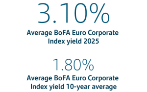 Mantemos uma perspetiva positiva para o crédito investment grade da Zona Euro em 2026. As yields permanecem atrativas — bem acima das médias dos últimos 10 e 20 anos — e oferecem um prémio adicional face à dívida soberana. A forte procura, sobretudo por parte de investidores particulares, e a solidez dos balanços empresariais deixam margem para um novo estreitamento dos spreads.