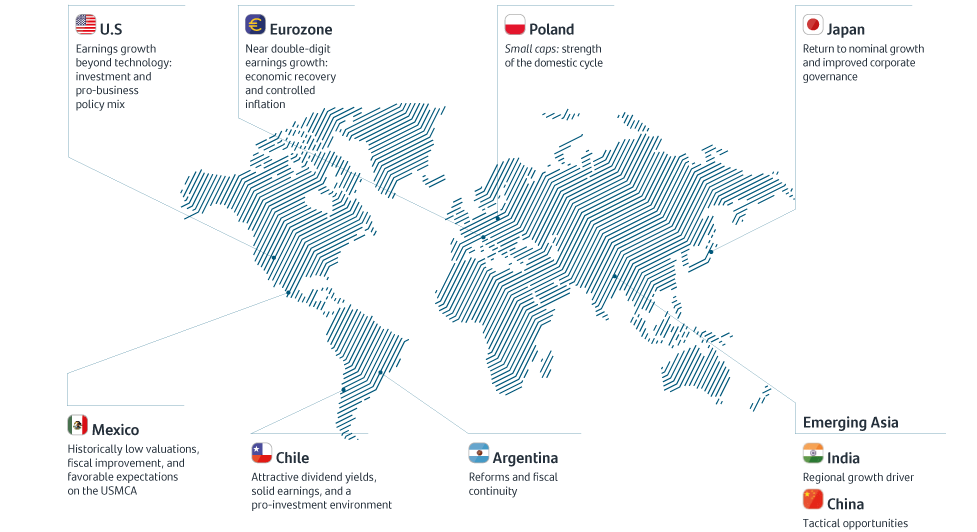 As ações continuam no centro da nossa estratégia para 2026. O enquadramento global apoia esta visão construtiva, que é ainda reforçada na maioria dos principais mercados quando analisamos a nível local. Desde o alargamento do crescimento dos lucros nos Estados Unidos — que vai além da tecnologia associada à inteligência artificial — até às estimativas de crescimento dos lucros próximas de dois dígitos na Zona Euro e ao dinamismo dos mercados da América Latina, as ações beneficiam simultaneamente de condições favoráveis a nível macroeconómico e de apoio doméstico, consolidando-se como o principal motor de crescimento nas carteiras diversificadas.